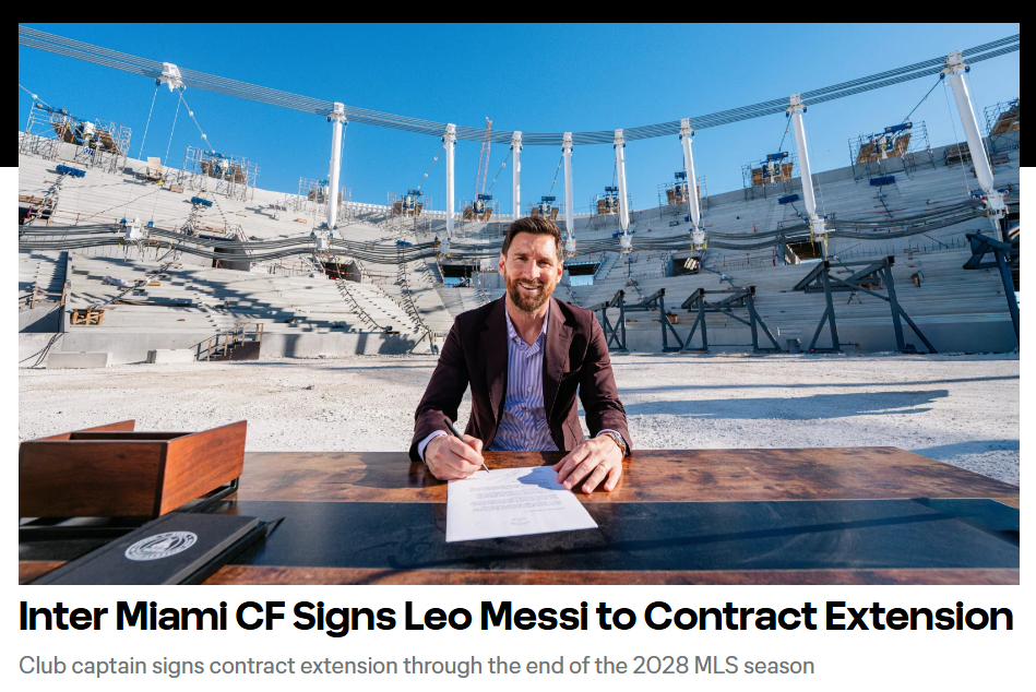 리오넬 메시메시가 인터 마이애미와의 계약 연장에 사인하고 있다 [인터마이애미 홈페이지 캡처]메시가 인터 마이애미와의 계약 연장에 사인하고 있다 [인터마이애미 홈페이지 캡처] 미국 메이저리그 사커 MLS의 \'최고 스타\' 리오넬 메시가 인터 마이애미와 2028년까지 3년 계약을 연장하는데 사인했습니다. 메시는 구단을 통해 \"이곳에서의 시간을 연장하게 되어 기쁘다\"면서 \"이곳에 오길 잘했다 생각하고, 계속 머물 수 있게 되어 기쁘다\"는 소감을 ...