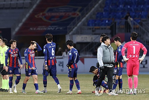 아쉬워하는 수원FC(수원=연합뉴스) 이지은 기자 = 8일 수원종합운동장에서 열린 프로축구 승강 플레이오프 2차전 수원FC와 부천FC의 경기. 2대3으로 지며 K리그2 강등이 확정된 수원FC 선수들이 아쉬워하고 있다. 2025.12.8 jieunlee@yna.co.kr(수원=연합뉴스) 이지은 기자 = 8일 수원종합운동장에서 열린 프로축구 승강 플레이오프 2차전 수원FC와 부천FC의 경기. 2대3으로 지며 K리그2 강등이 확정된 수원FC 선수...