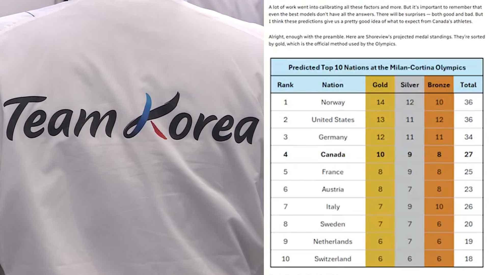 우리나라가 밀라노·코르티나 동계 올림픽에서 종합 순위 14위에 머물 것이라는 전망이 나왔습니다. 동계 스포츠 강국 캐나다 공영방송 CBC가 자국 스포츠 정보 분석 업체에 의뢰한 바에 따르면 한국은 금메달 3개, 은메달 2개, 동메달 2개를 획득해 메달순위 14위에 오를 것으로 예상됐습니다. 한국은 지난 2022 베이징 대회 당시 금메달 2개등 메달 갯수 총 9개로 14위에 오른 바 있습니다. 업체가 예측한 예상 종합 1위는 노르웨이였고 이...